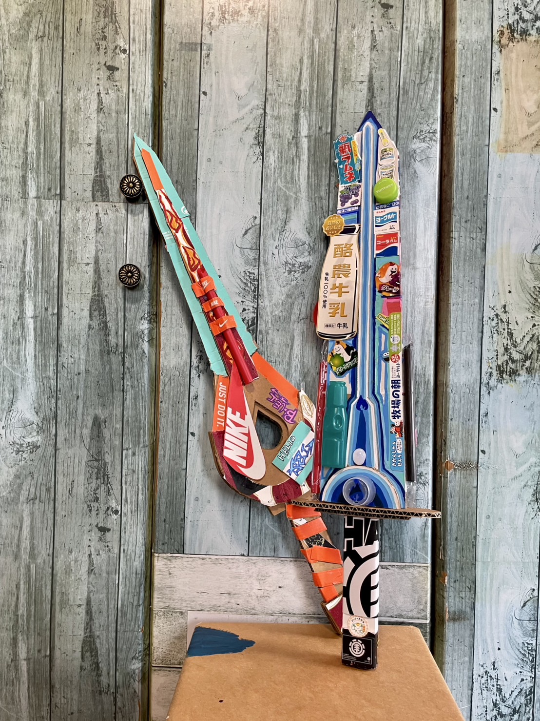 強化ダンボールを使用し剣を作ります。家にある色々な廃材(捨てようと思っていたもの)をデコレーションして、更に強度もアップします。カッコいい武器を作ってあそびましょう。