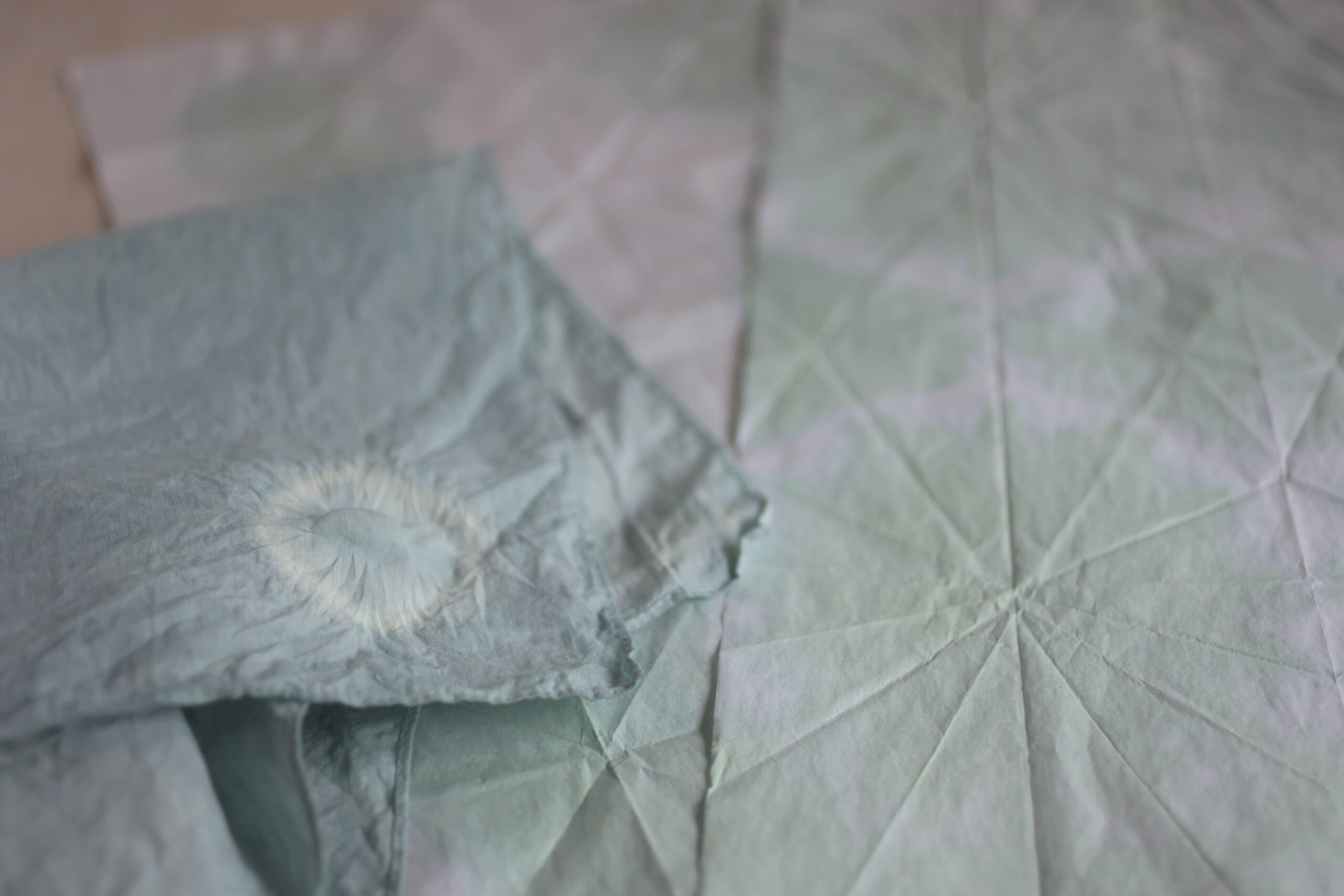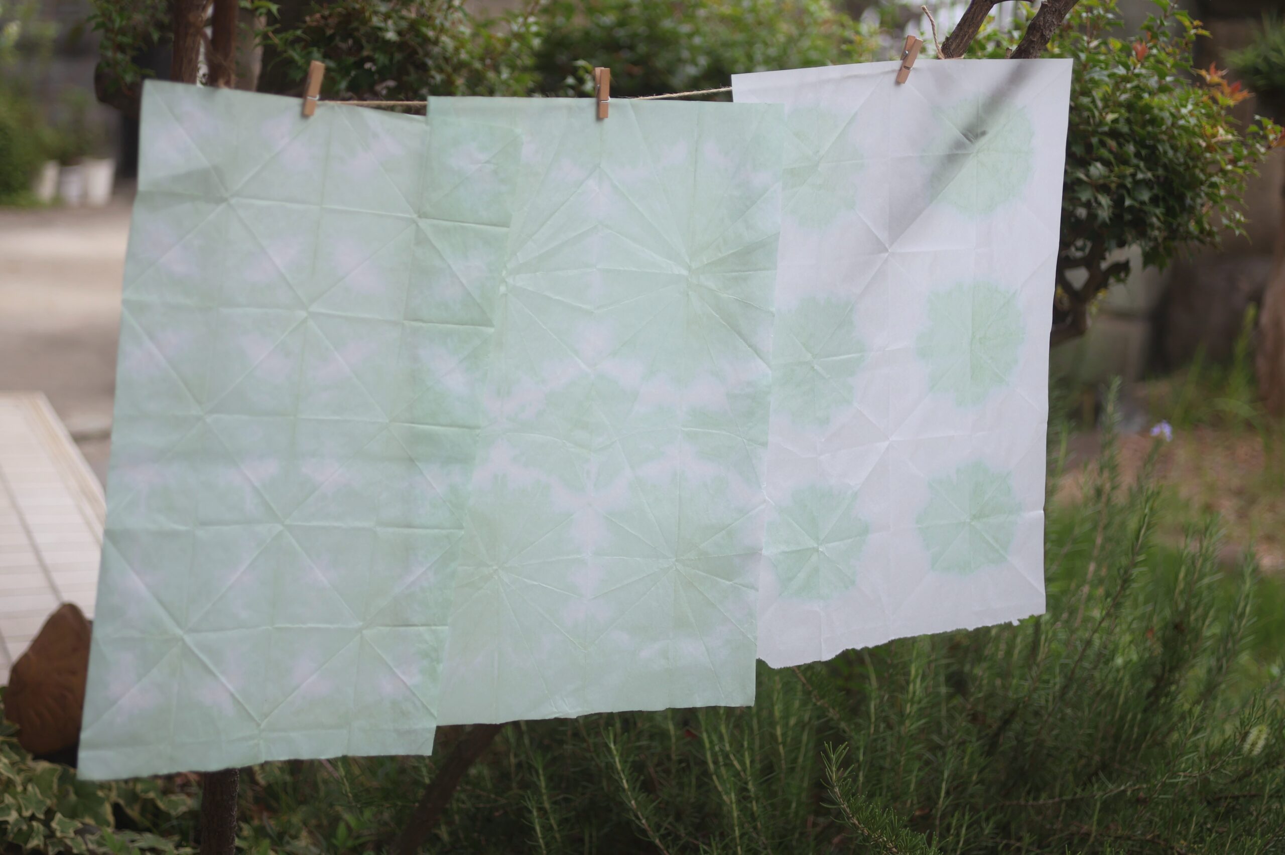 屋上庭園で育てたタデアイを使って、染め液を作ります。ハンカチの生葉染めと、紙の折染めの2種類の染色を体験していただけます。折染めした紙は、折り畳んでブックカバーやラッピングペーパー等、自由に使用できます。